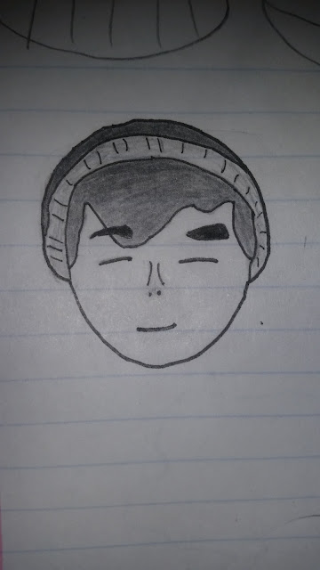 For those of you who've read past post you would know that I did a cartoon character of myself but when I looked back to it and gave some thought into I realized my mistake. I didn't actually use me as reference which is why my new profile pic is what it is and why I made a new character version of me. I know it is a bit hard to tell but the picture is me and my chinese looking eyes ( not actually chinese but many people think that ), small nose, bushy eye brows and very thick fluffy hair. There are some other features I would like to add in the future ( like the scar I have under my my brow ( can't remember which side )) but I just wanted to get this done quick so I could use it for my profile pic. I also added a beanie as I do wear them a lot. For this pic I used my smooth shading for the shadow of the nose ( hard to see in pic I know ) and hat while using the lined shading on the hair. I the used my Sakura illustrator pens for the outlining of the pic and the graphic marker for the brows. Overall these is a pretty accurate drawing of me as I do find myself smiling a lot.